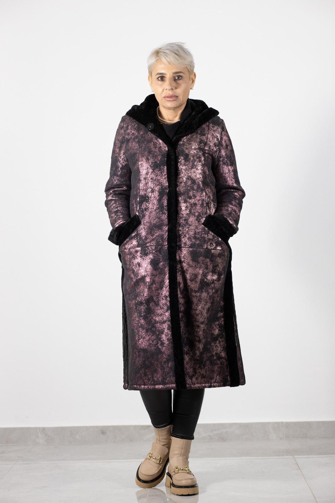 Acest cojoc sofisticat atrage toate privirile prin finisajul său metalic în nuanțe de roz închis, care îi conferă un aer modern și rafinat. Croiala lungă și detaliile deosebite asigură un echilibru perfect între confort și eleganță, fiind ideal pentru ocazii speciale sau ieșiri de iarnă.