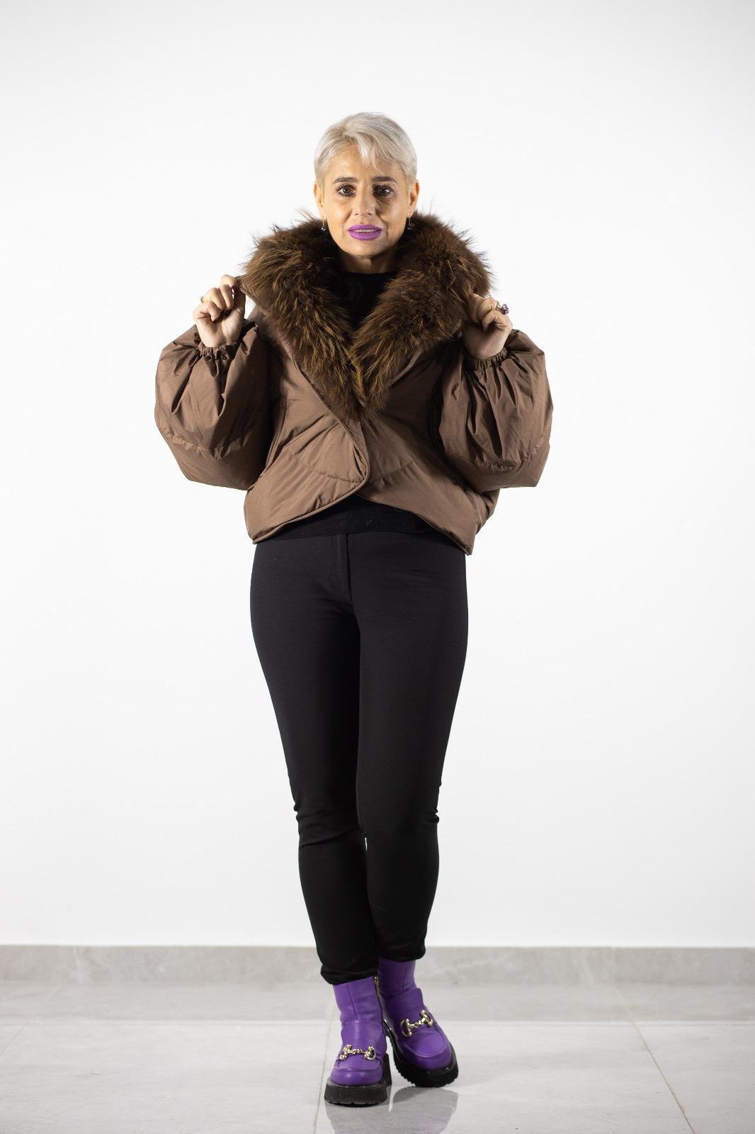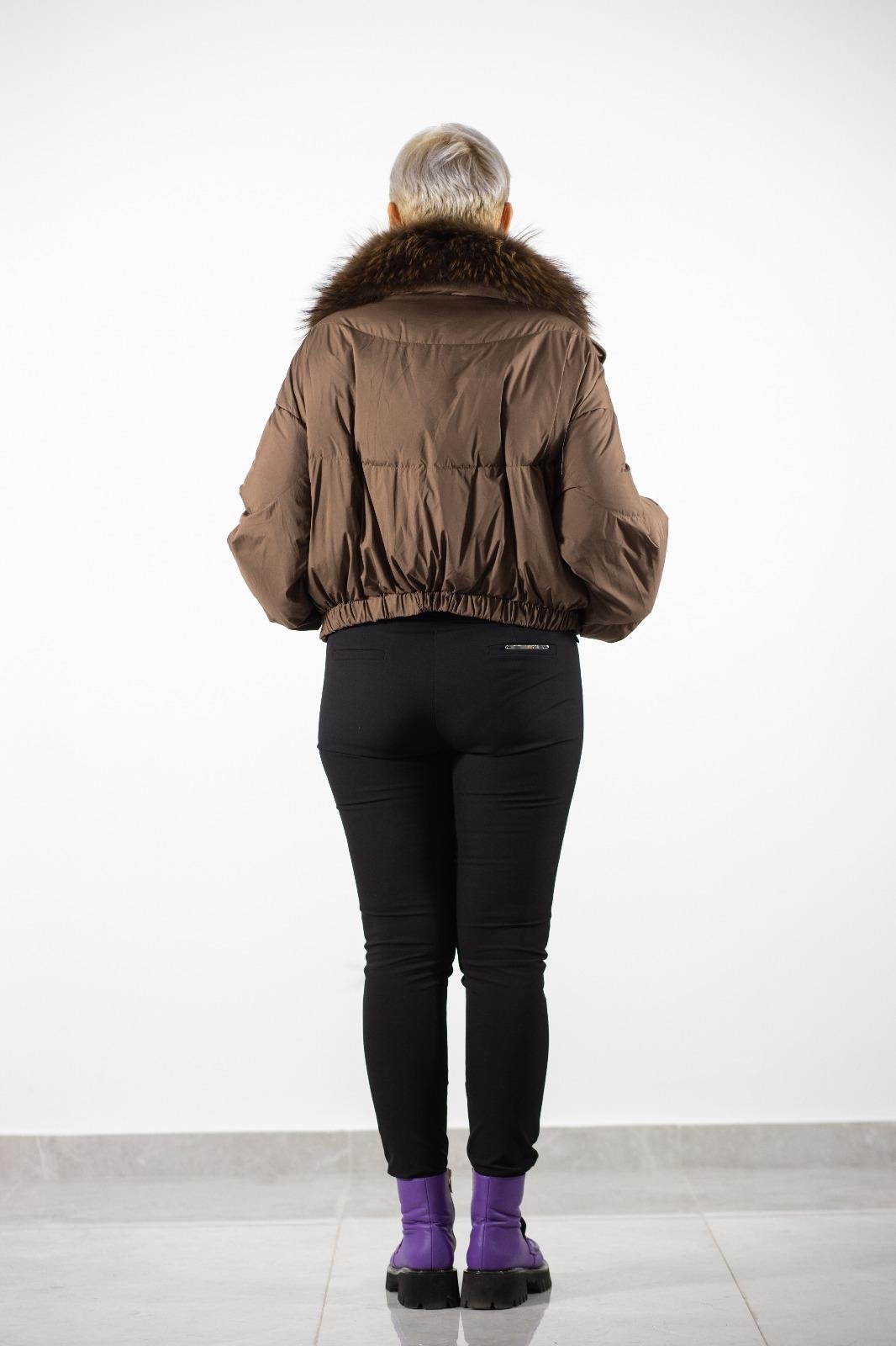 Geacă maro cu detalii din blană naturală, eleganță și confort pentru sezonul rece.