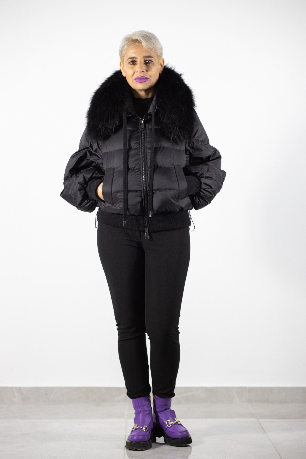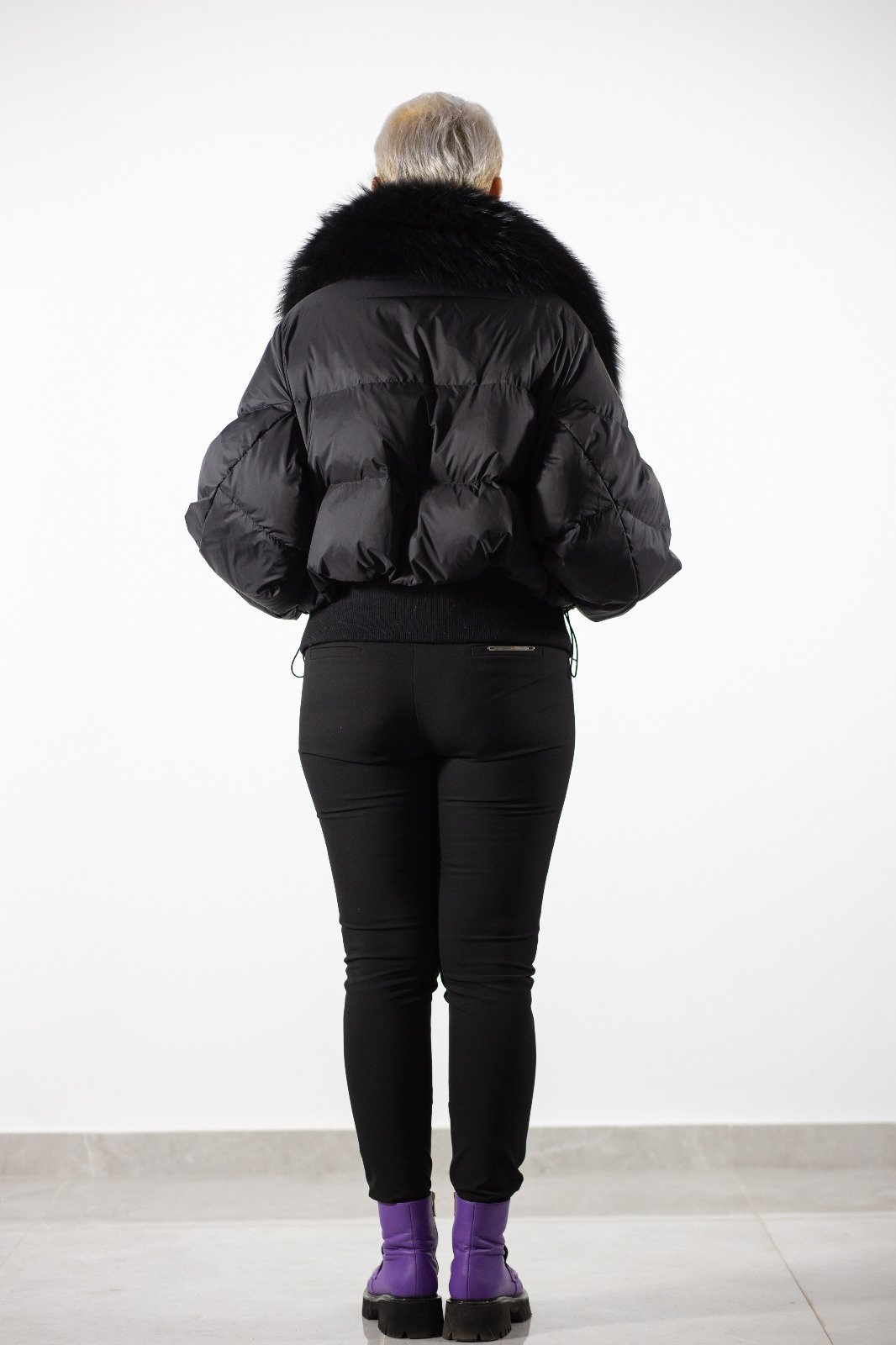 Această geacă scurtă neagră matlasată, completată de un guler voluminos din blană naturală, este ideală pentru un look modern și sofisticat. Designul compact și versatil o face perfectă pentru orice ocazie în sezonul rece.