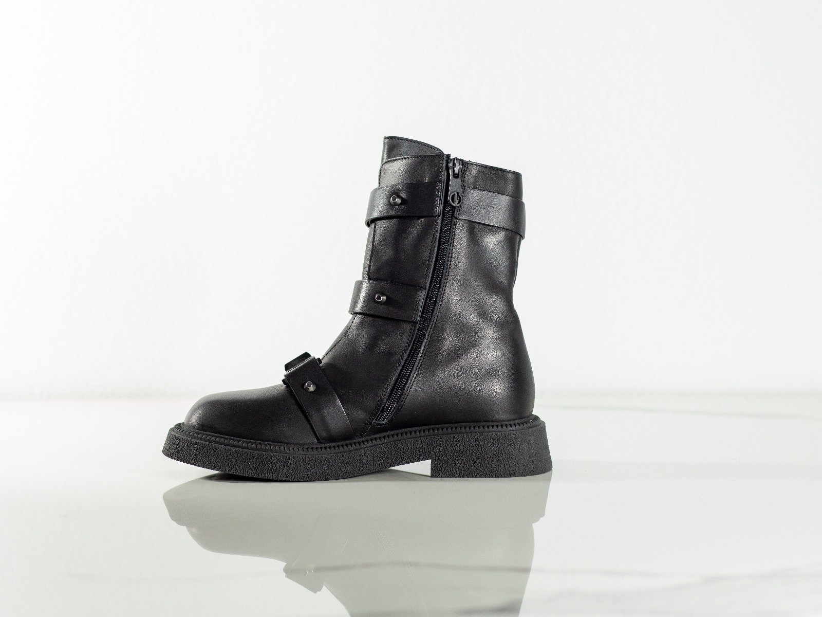 Ghete damă din piele, talpă groasă și curele decorative, look modern.