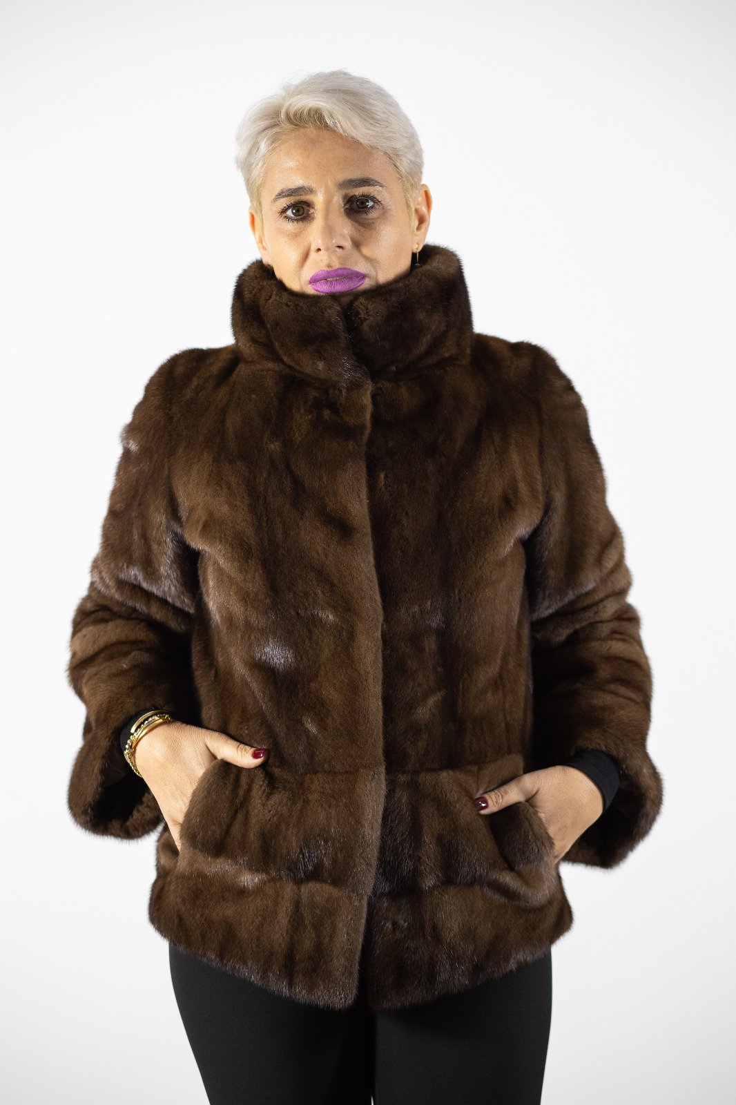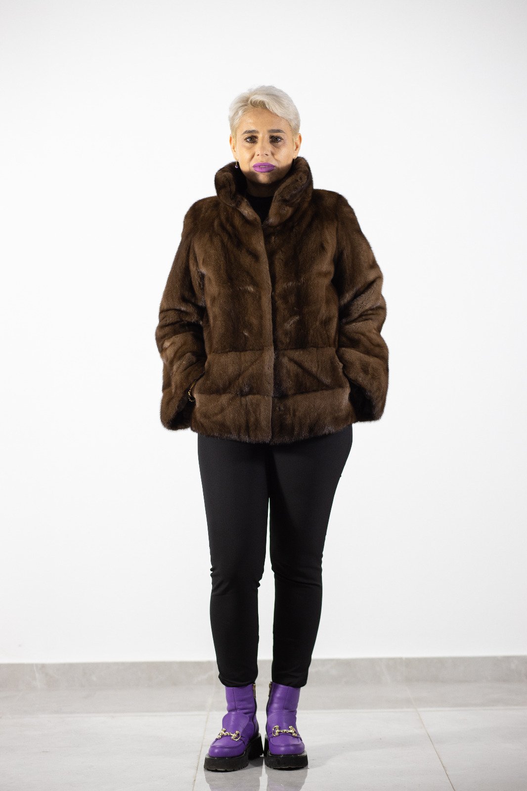 Această geacă din blană naturală de vizon, într-o nuanță caldă de maro, emană rafinament și confort. Ideală pentru evenimente formale sau pentru a adăuga un plus de stil garderobei tale de iarnă.