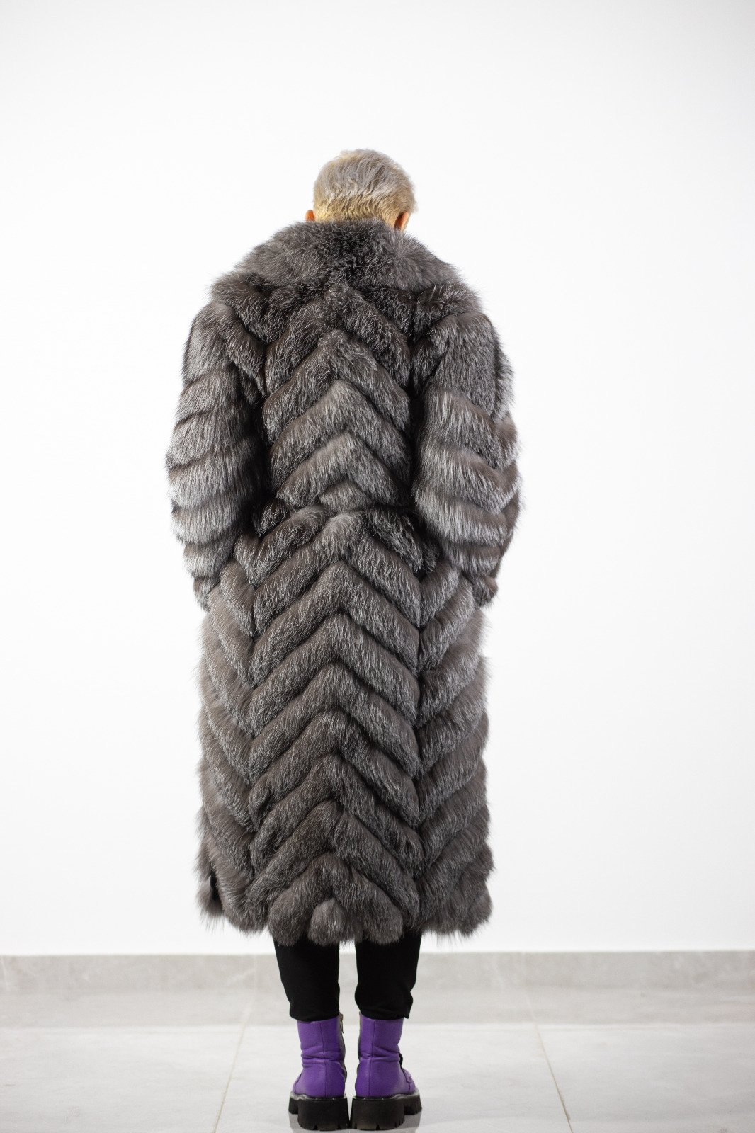 Această haină lungă din blană naturală de calitate superioară se remarcă prin designul său sofisticat și textura luxoasă. Nuanța argintie, cu un efect discret de degrade, oferă un aer imperial, iar croiala amplă și gulerul generos adaugă un plus de eleganță și confort termic, ideal pentru sezonul rece.
