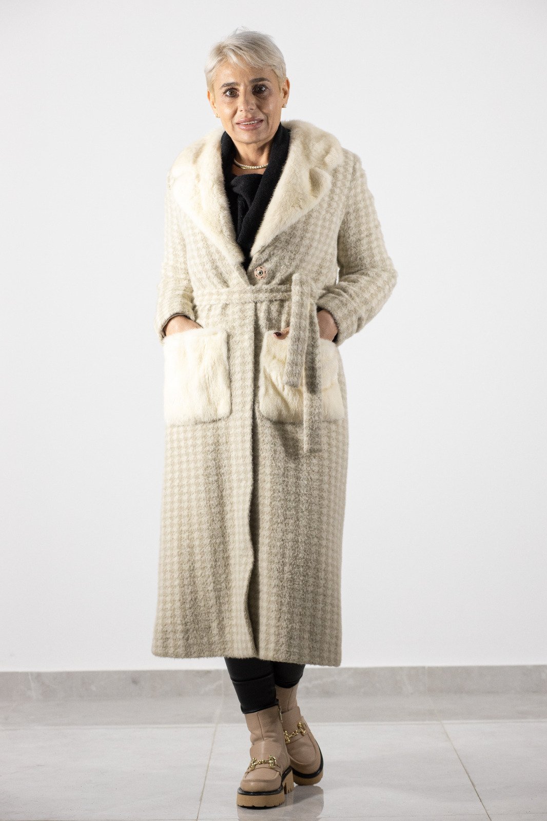 Cu un design modern și rafinat, acest palton din alcantara impresionează prin textura sa moale și elegantă, completată de buzunarele din blană naturală de vizon. Perfect pentru femeile care apreciază stilul clasic cu un accent de lux subtil, acest palton este alegerea ideală pentru sezonul rece.