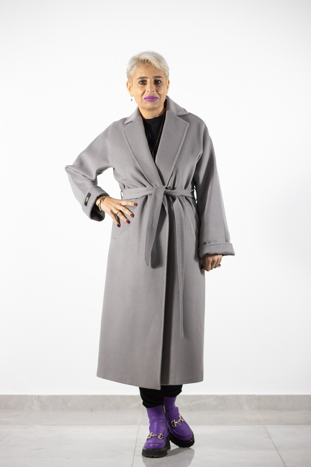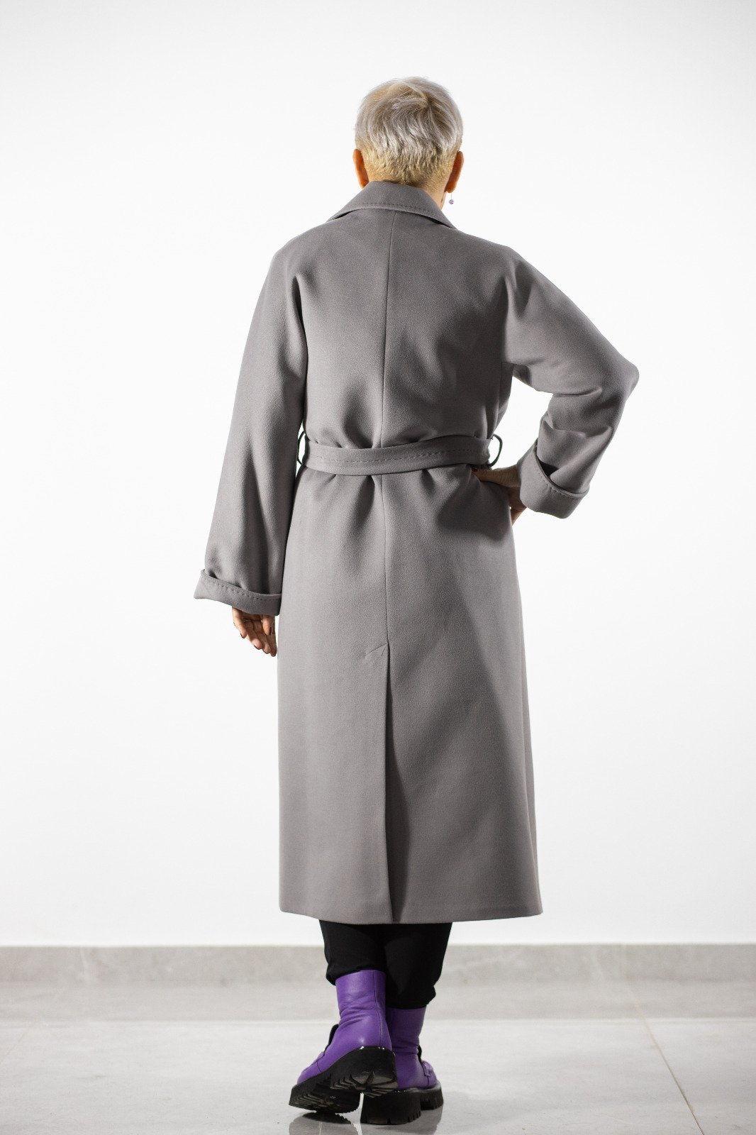 Palton lung cu croială fluidă, minimalism modern și nuanțe de gri.