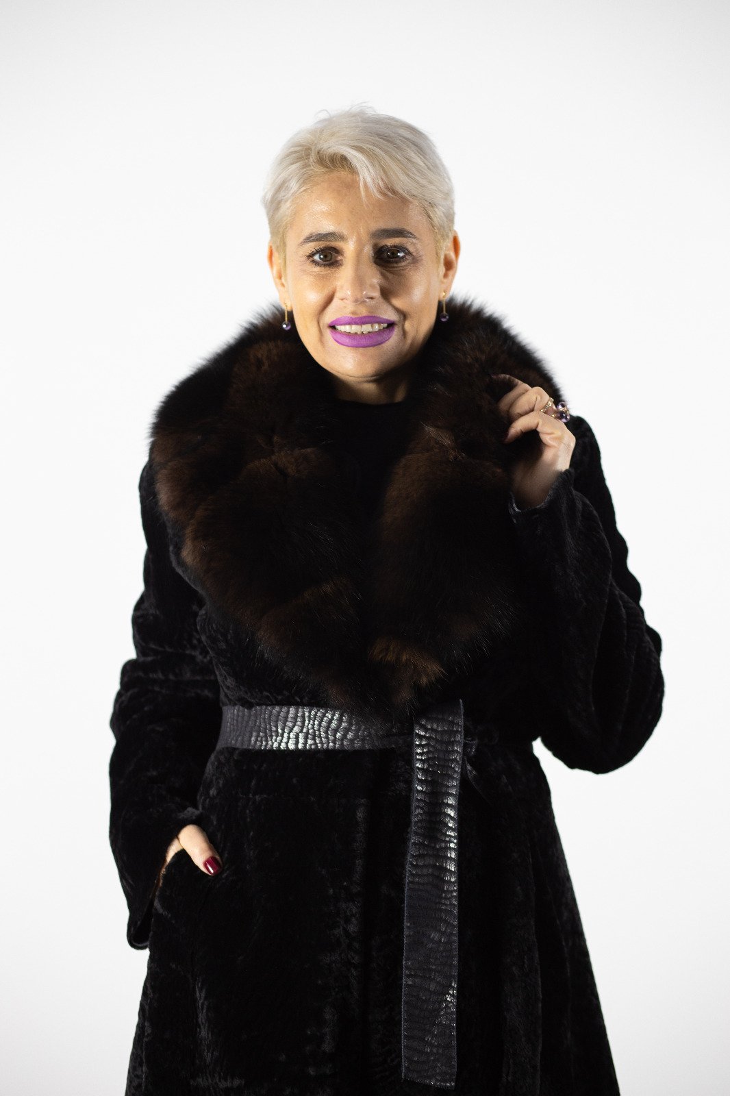 Această haină lungă din blană naturală impresionează prin textura moale și finisajele de lux. Gulerul amplu adaugă un plus de rafinament, iar centura delicată accentuează talia pentru un look sofisticat.